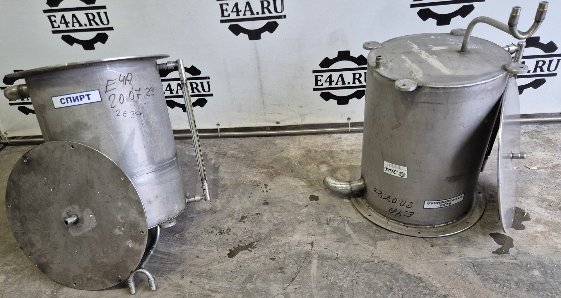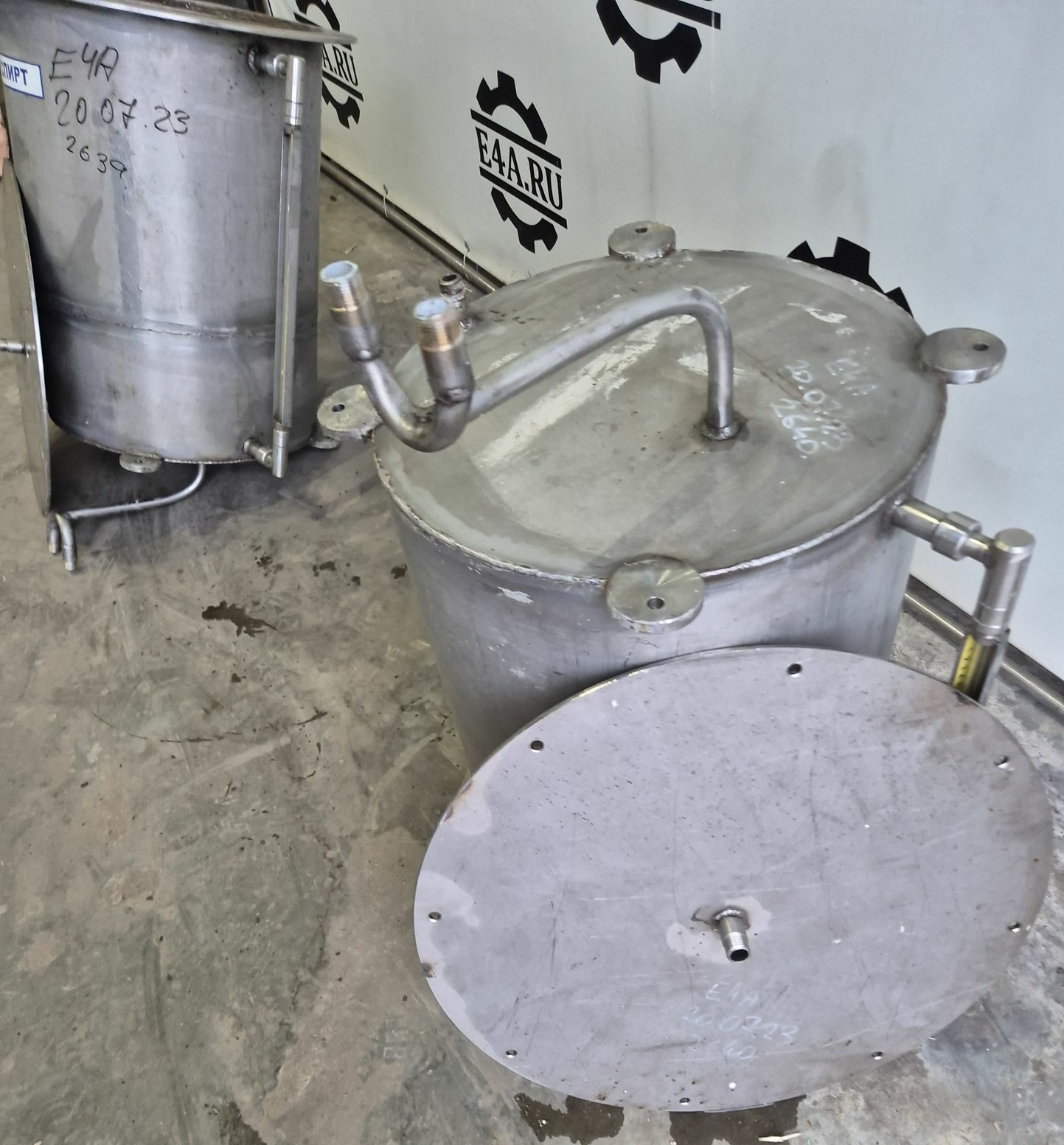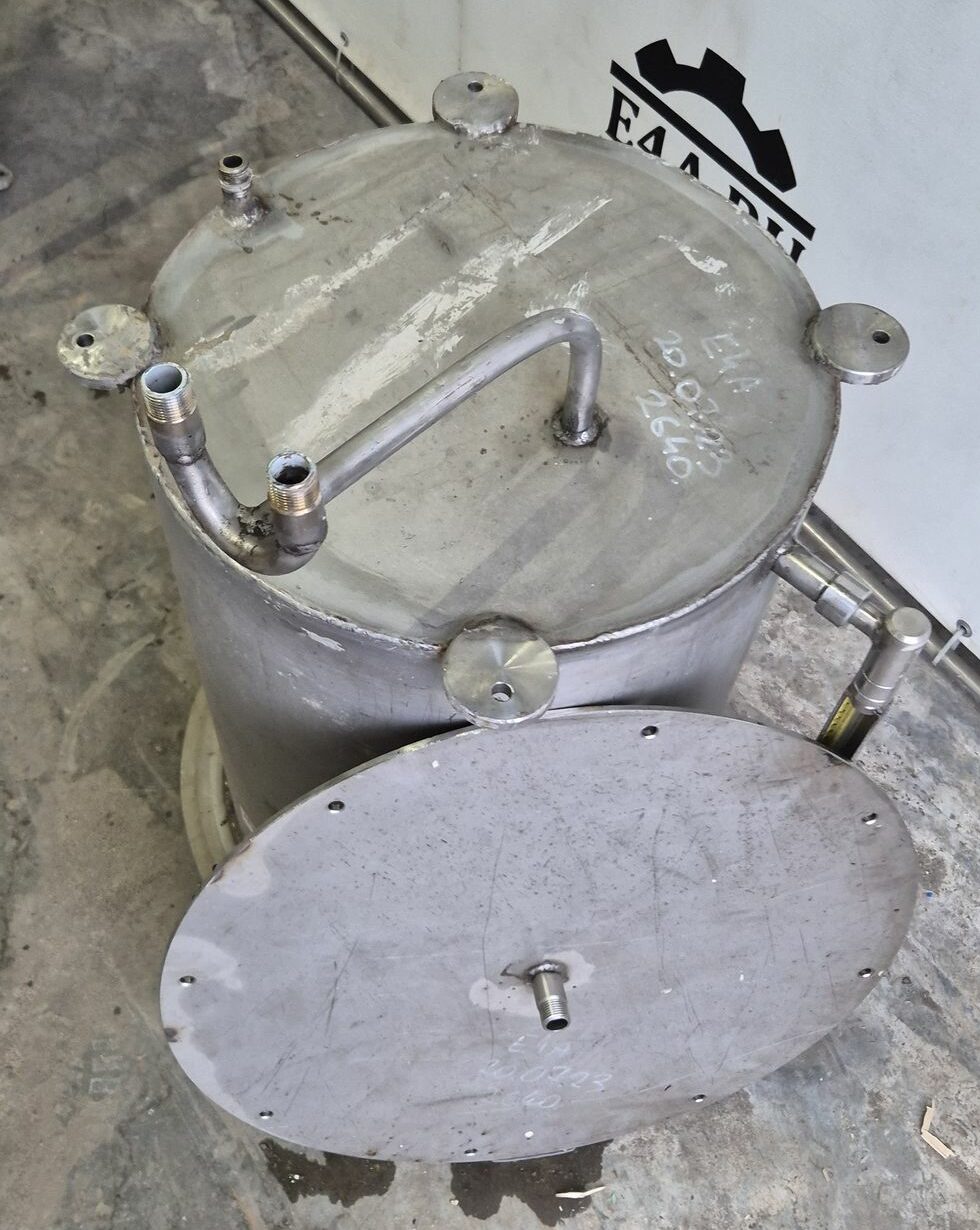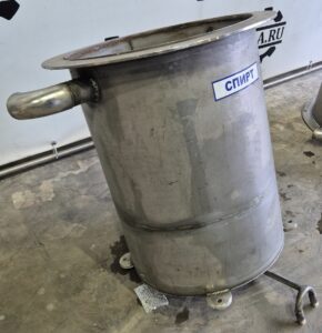 Емкости нержавеющие, объем 90 л, вертикального исполнения с крышкой. В наличии 2 шт. Размеры внутренней части емкости: высота — 0,6 м, диаметр — 0,44 м. Инв 2639, инв 2640.
