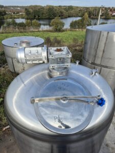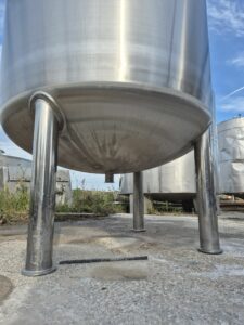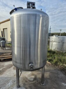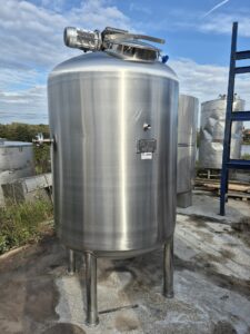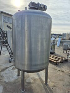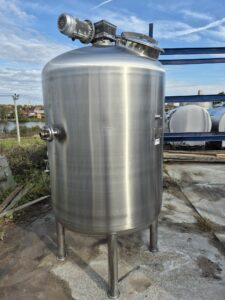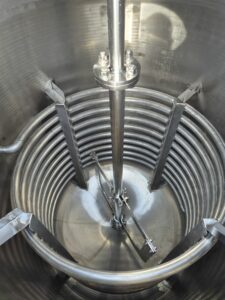 Емкость нержавеющая, объем 1,5 куб.м., вертикального исполнения, внутри имеется змеевик для нагрева или охлаждения и мешалка якорного типа. Размеры — 2,6 м общая высота, 1,2 м диаметр. Инв 4068.