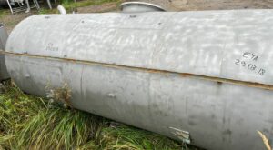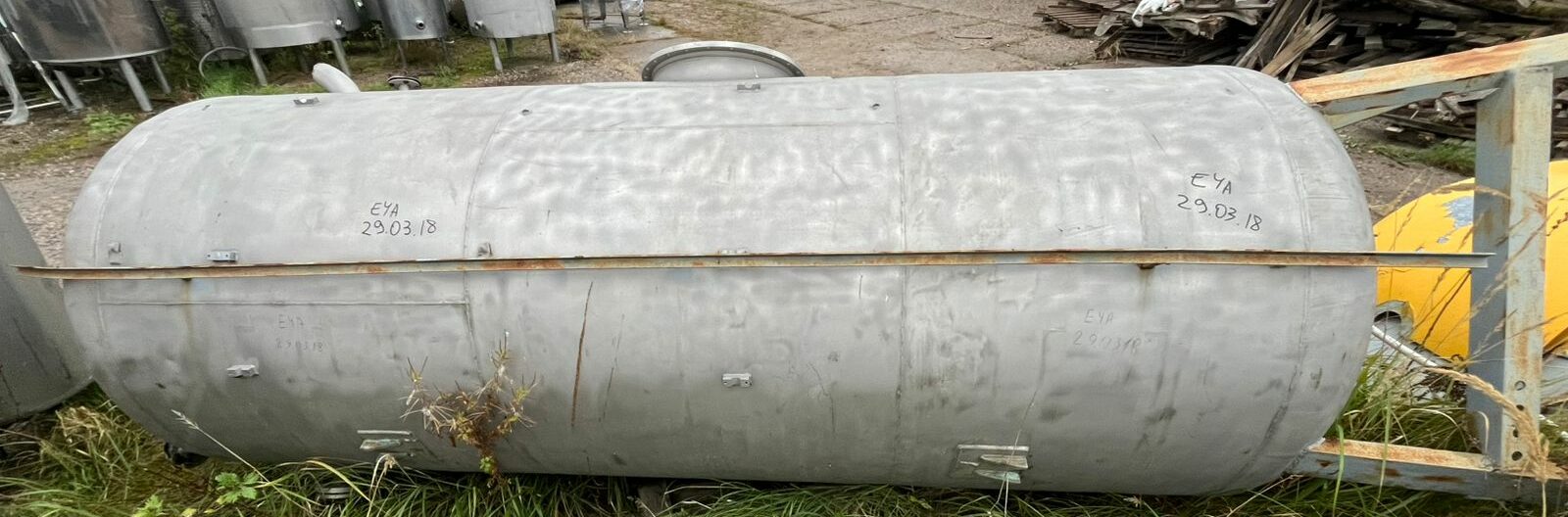 Емкость нержавеющая, объем 3,3 куб.м., можно использовать как вертикально, так и горизонтально. Габариты — 1,2м диаметр, 3,8м высота в месте с ножками. Толщина стенки — эллиптические части 5мм, цилиндрические части 3мм.