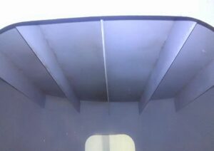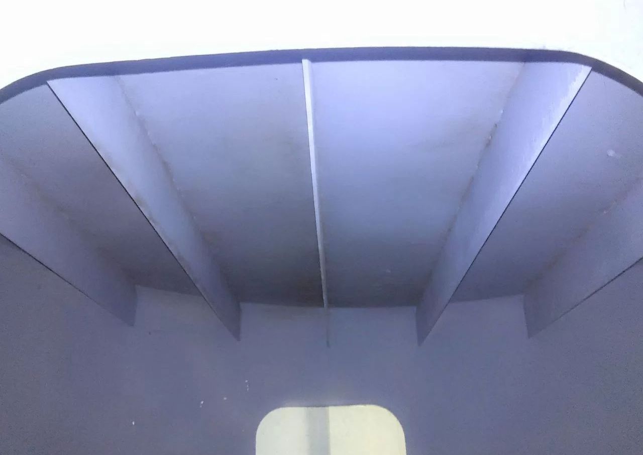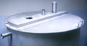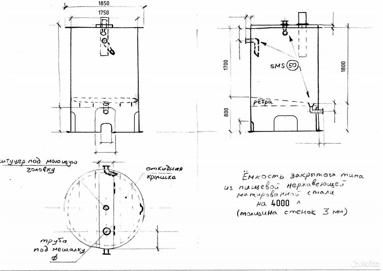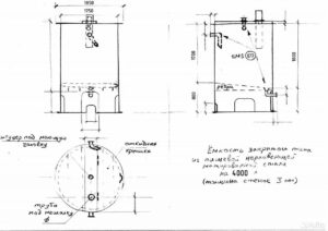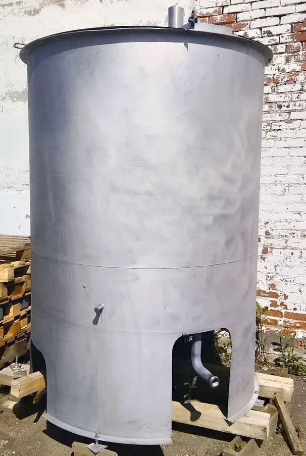 Емкость нержавеющая, объем 4 куб.м., вертикального исполнения, плоское дно с наклоном в сторону слива. Размеры — 1,85 м диаметр, 2,7 м общая высота.