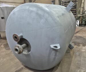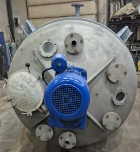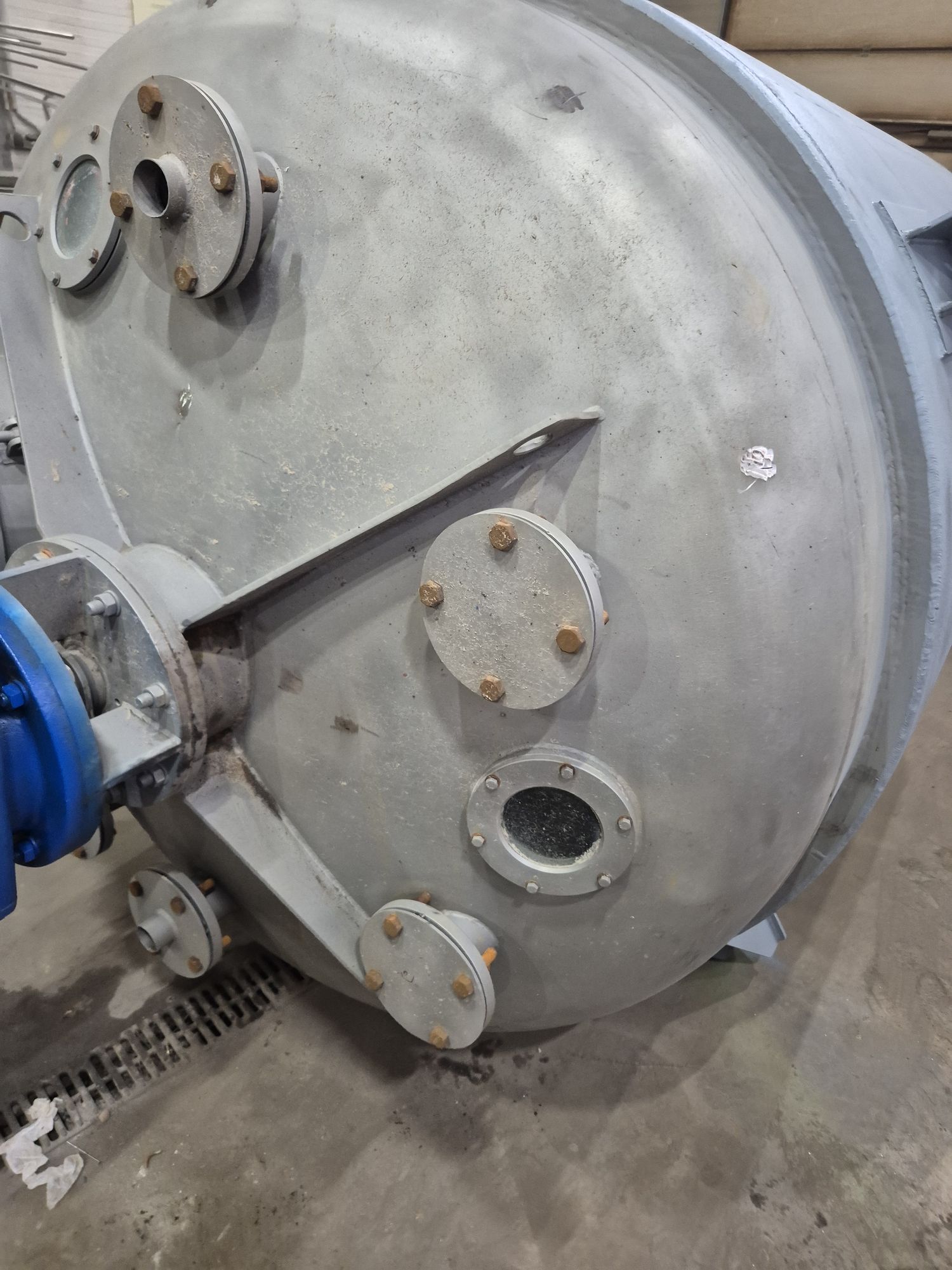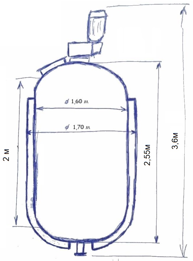 Реактор нержавеющий (варочный котел), объем 4 куб.м., рубашка, мешалка. Мешалка 30 об/мин, двигатель 5,5 кВт. Габариты — 3,85м общая высота, 1,7 м наружный диаметр. Инв 4014