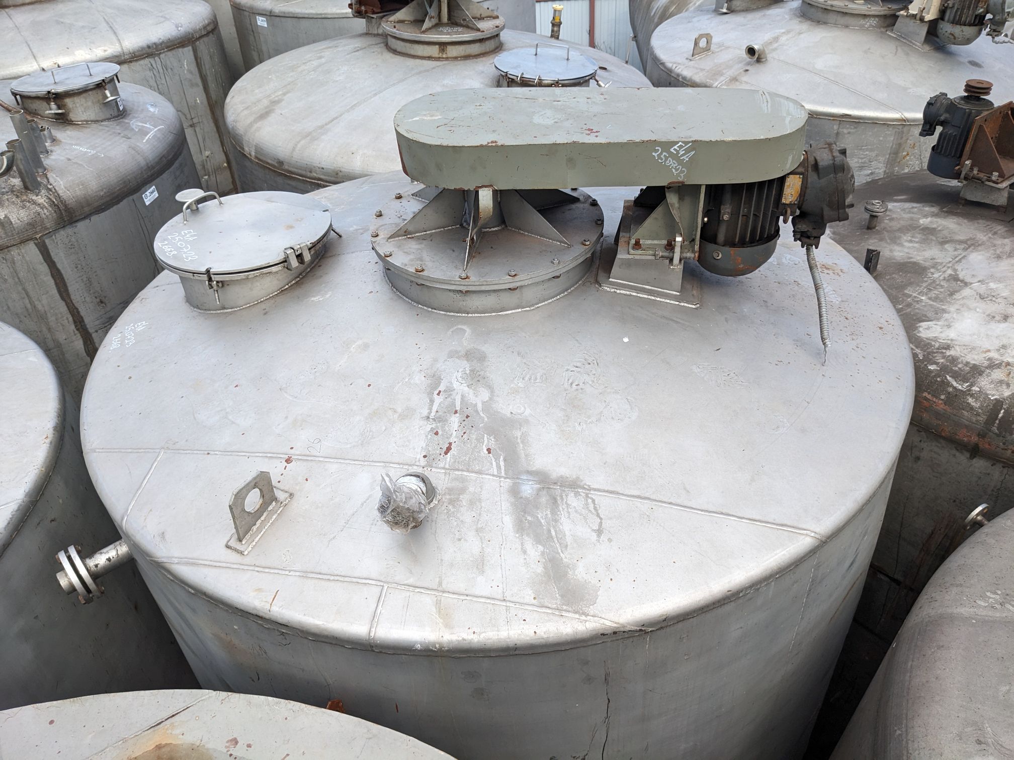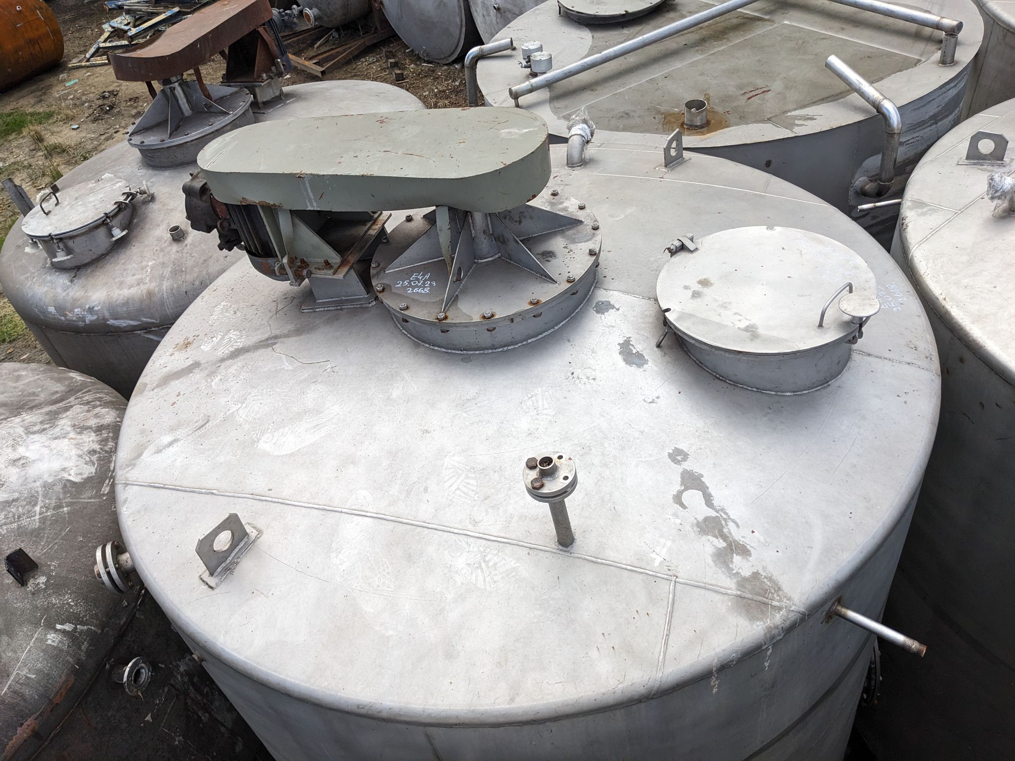 Емкости нержавеющие, объем 8,5 куб.м., с перемешивающим устройством. Габариты — общая высота 3,45м, диаметр 2,16м. Толщина стенки — 3,5 мм верхняя и нижняя часть, 3 мм цилиндрическая часть. !!!РЕЗЕРВ 2 шт!!!
