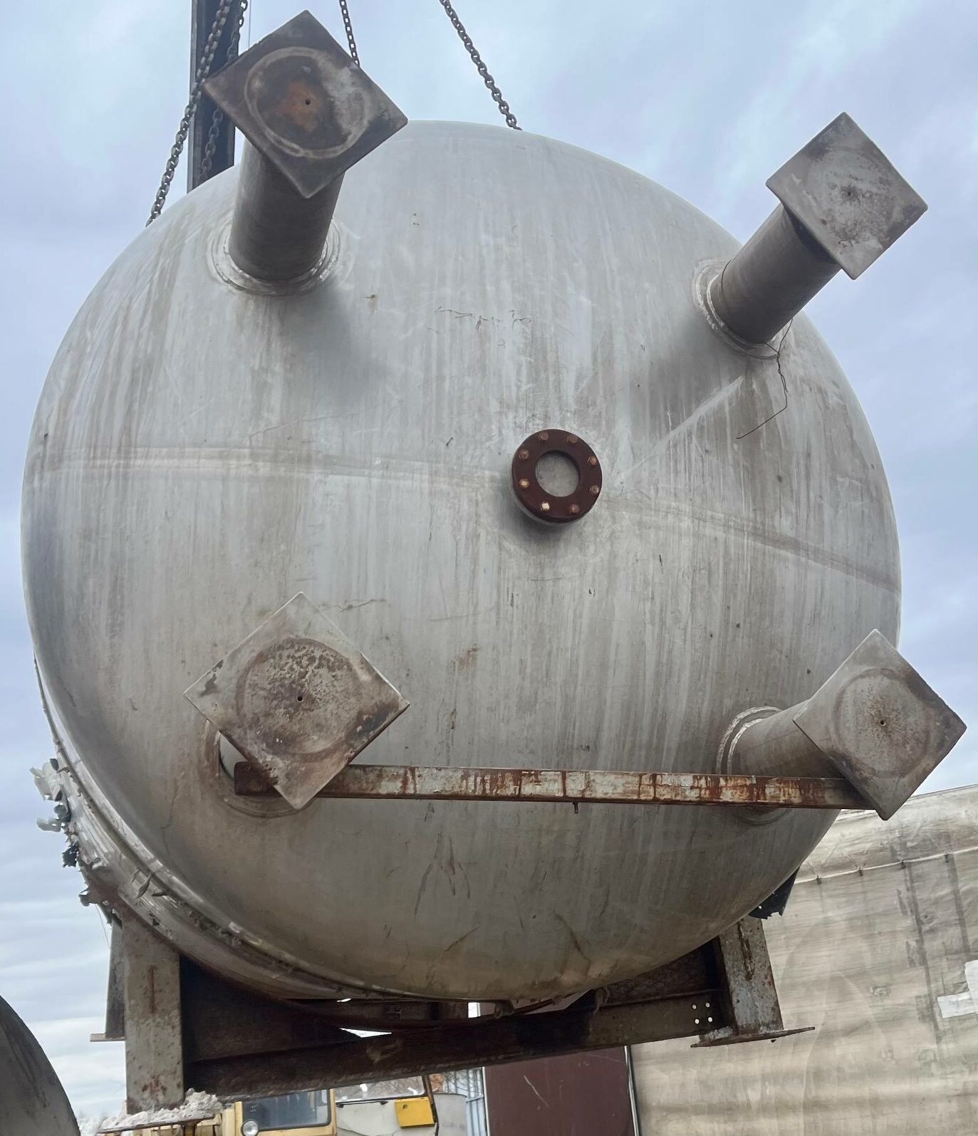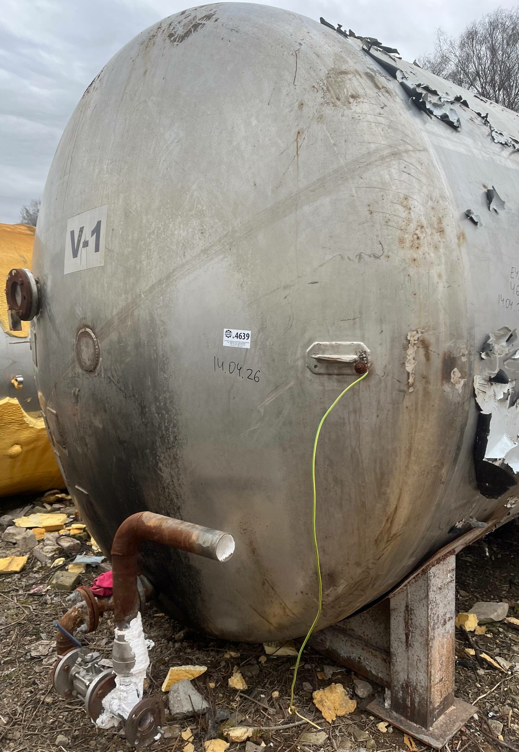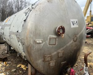 Емкость нержавеющая, объем 20 куб.м., вертикального исполнения, можно использовать горизонтально. Размеры: Общая длина — 5,9 м, диаметр — 2,38 м, длина цилиндрической части — 4,6 м. Толщина стенки — 4 мм цилиндрическая часть, 6 мм эллиптические части.