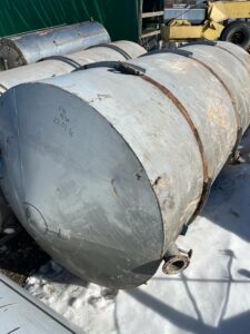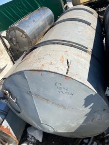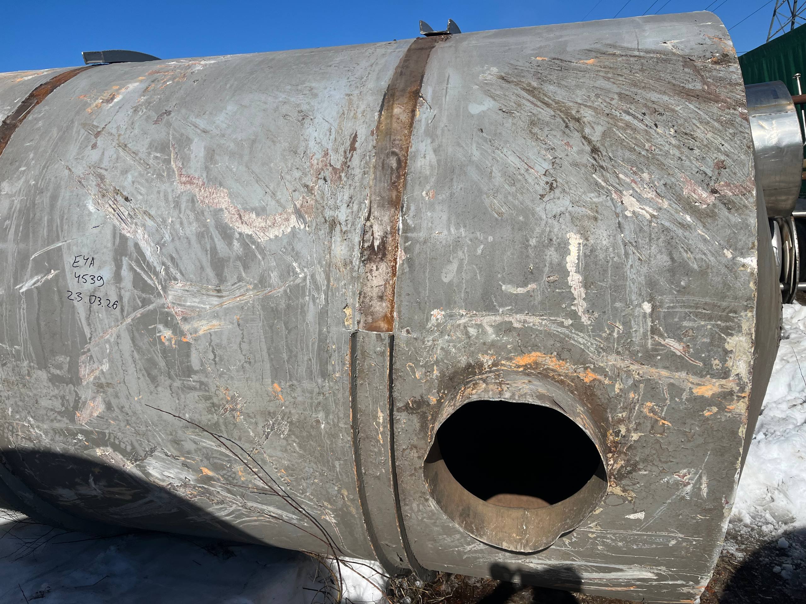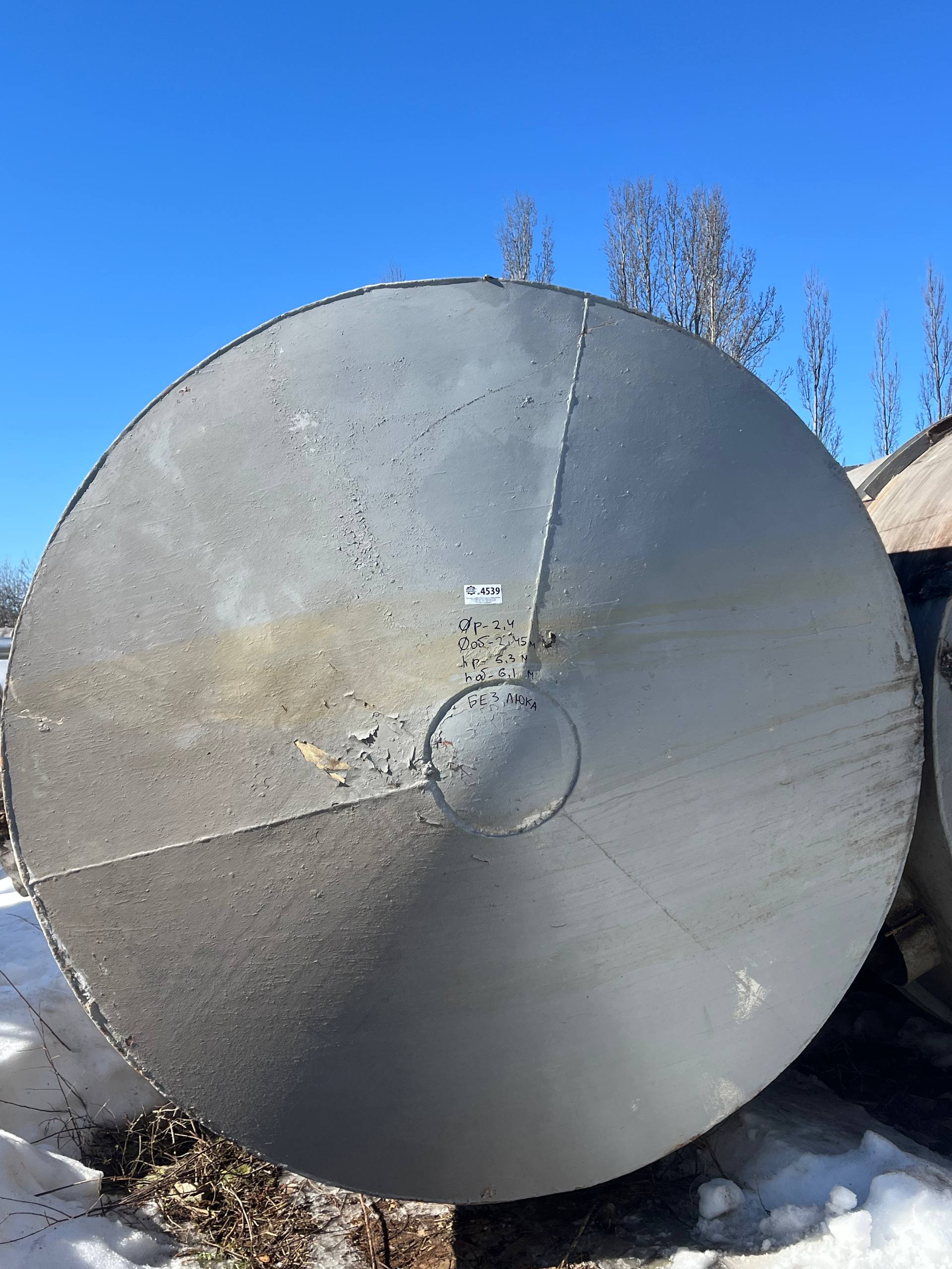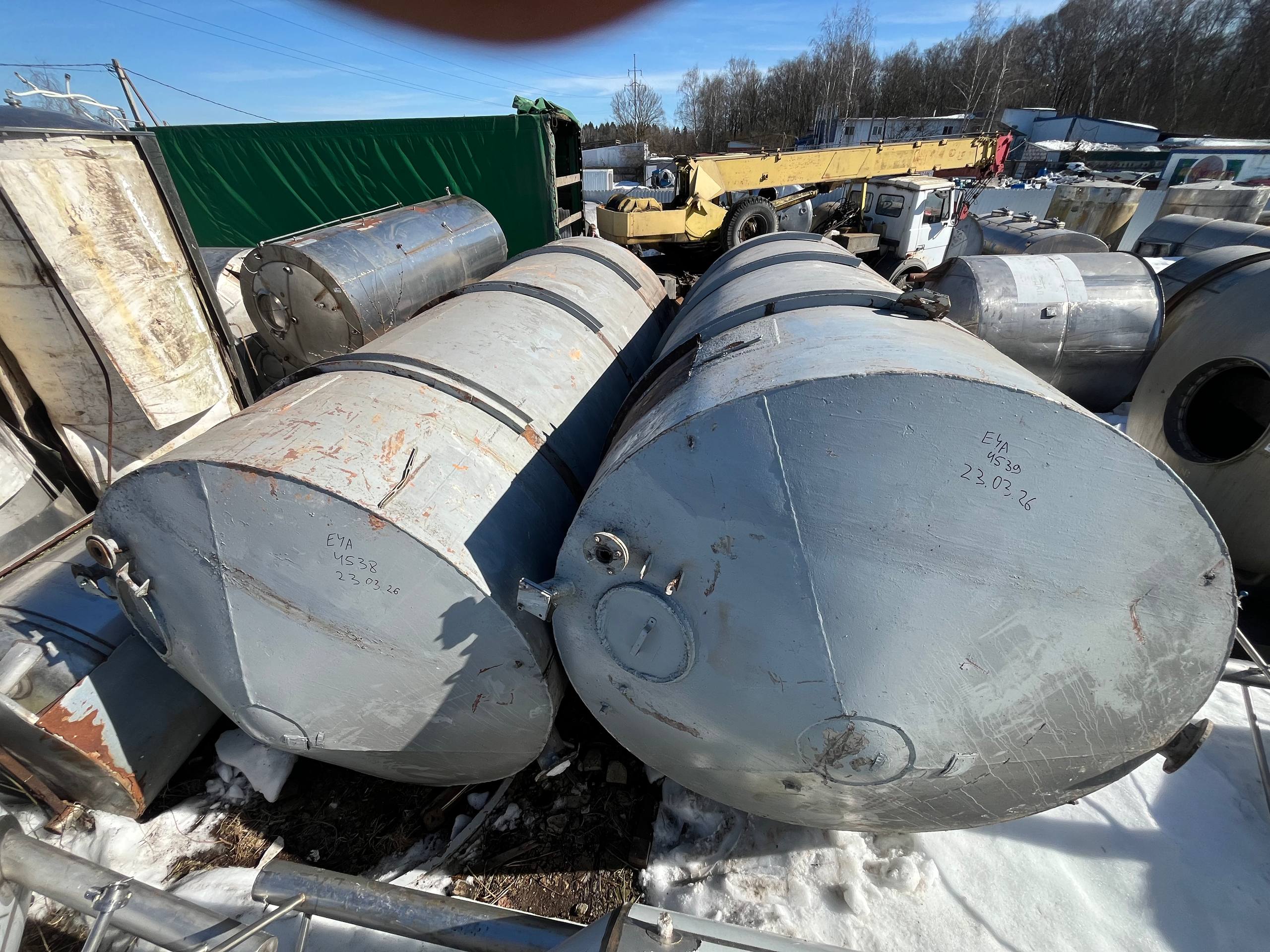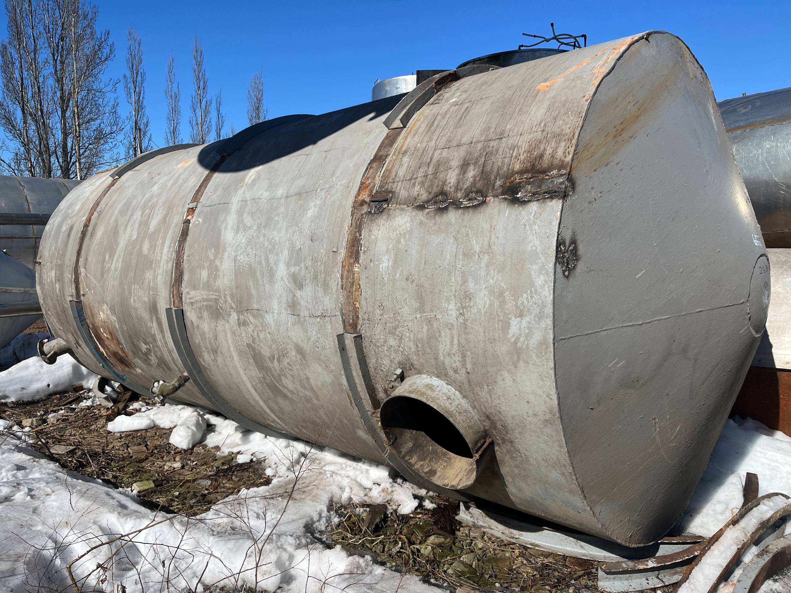 Емкости нержавеющие, объем 25 куб.м., горизонтального исполнения. Размеры — 2,4 м внутренний диаметр, 5,3 м длина цилиндрической части, 6,1 м общая длина, 2,5-2,55 м диаметр с учётом рёбер жёсткости. Емкости с пищевого производства, хранился виноматериал. Количество 5 штук.