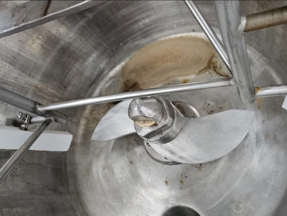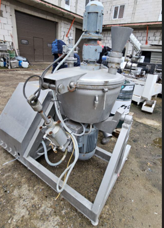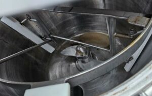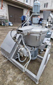 Для более быстрого нагрева продукта внутри чаши расположены два клапана для подачи острого пара непосредственно в продукт.Внутри чаши для измельчения и смешивания продукта находится режущая насадка, которая приводится во вращение электродвигателем. Скорость вращения режущей насадки плавно регулируется преобразователем частоты от 800 об/мин до 3000 об/мин. Для предотвращения появления нагара на стенках чаши при нагреве продукта через стенку рубашки, внутри неё установлена мешалка со скребками из пищевой резины, которые, благодаря своей конструкции, при движении всегда прижимаются к стенкам чаши. Для очистки крышки чаши на мешалке установлен фторопластовый скребок.Крышка чаши при открытии откидывается на 90градусов назад посредством пневмоцилиндра. На крышке расположена воронка с шиберной заслонкой для догрузки компонентов во время работы смесителя-измельчителя, а также вакуумная камера с клапаном для создания вакуума, с электронным датчиком давления, с предохранительным клапаном и клапаном для сброса вакуума.