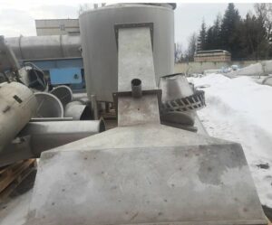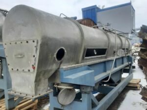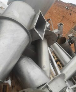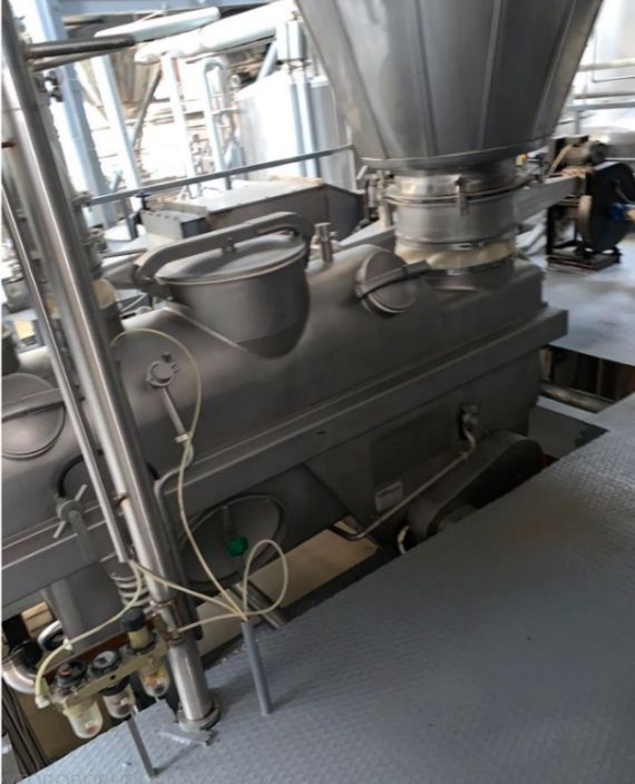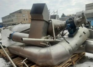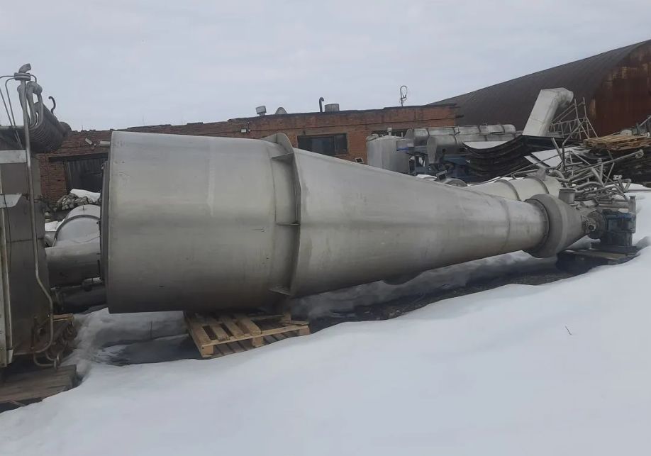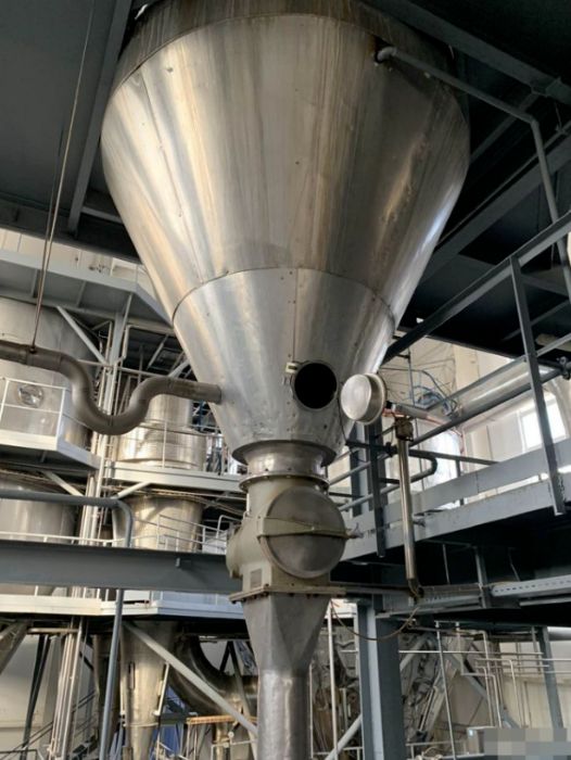 Сушильная установка состоит из сушильной башни, воздухонагревателя, приточного и вытяжного вентиляторов. Продукт распыляют в башне с помощью форсунки, воздух подают в башню сверху параллельно продукту (прямоточный тип подачи воздуха). Сушильная башня выполнена из ряда сварных цилиндрических секций из нержавеющей стали. Нижняя часть башни имеет коническую форму. Горячий воздух получают в прямоточном воздухонагревателе косвенного подогрева, где воздух нагревается сжигаемым в газовых форсунках газом. Горячий воздух смешивается до нужной температуры с холодным воздухом и подается в сушильную башню. На конусной части башни укреплены электромагнитные молотки для облегчения сброса продукта в конус башни. Внизу конус заканчивается виброситом с виброохладителем. Отработавший воздух из башни эвакуируется вытяжным вентилятором через циклон, где осаждается захватываемый воздухом мелкий порошок продукта. Дополнительная комплектация: -вакуум выпарная пленочного типа 5тчас -насос высокого давления APV(гомогенизатор) -газогенератор