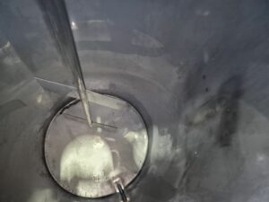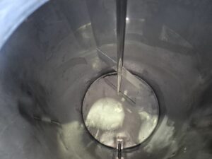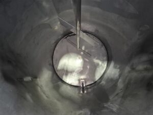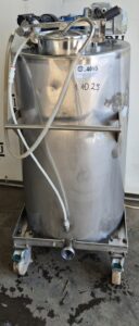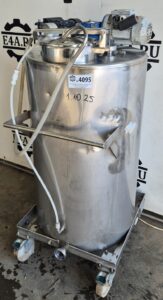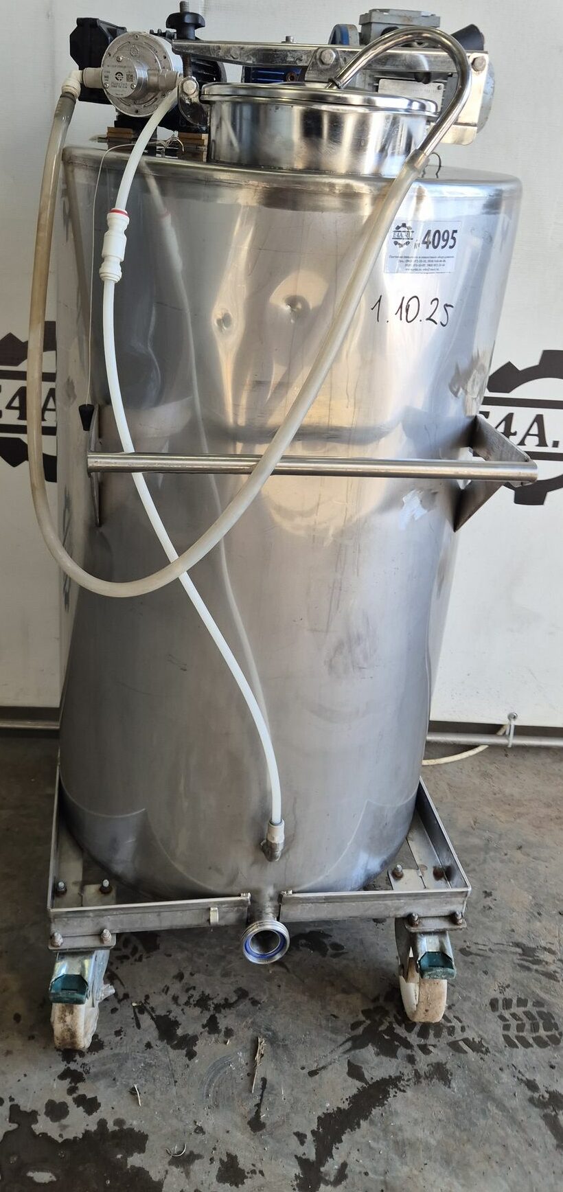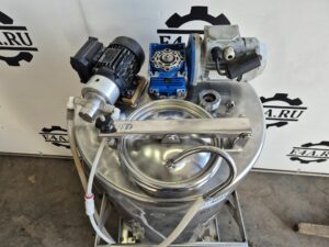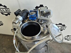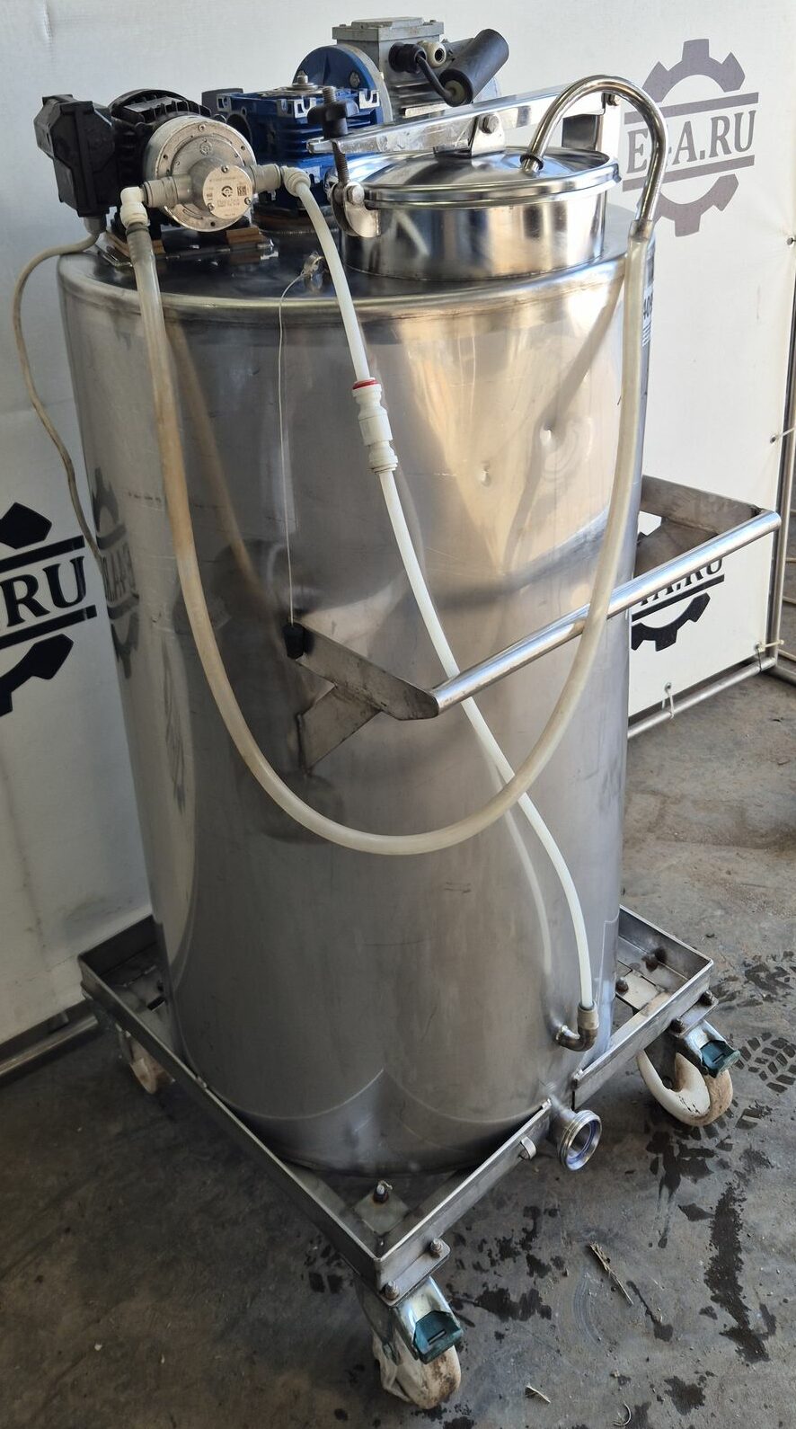 Емкость нержавеющая, объем 0,2 куб.м., вертикального исполнения, на колесах с мешалкой лопастного типа. Скорость вращения мешалки 34 об/мин. Мощность двигателя 0,18 кВт. Размеры 0,57 м ширина, 0,57 м длина, 1,27 м общая высота. Диаметр люка 22 см. Инв 4095.