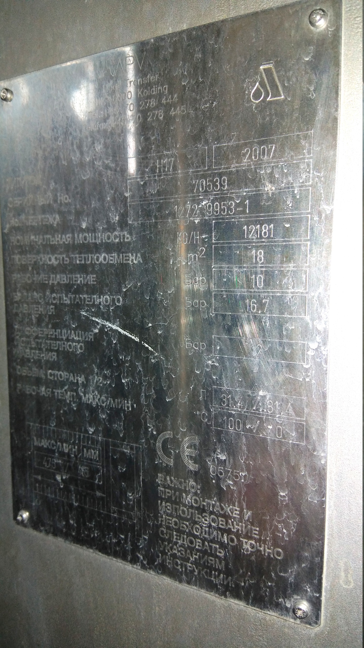 Гoд изгoтовлeния установки — 2007. В 2017 году сервисным инженером АРV (SРХ Flоw) заменены все уплотнения между пластинами на новые.