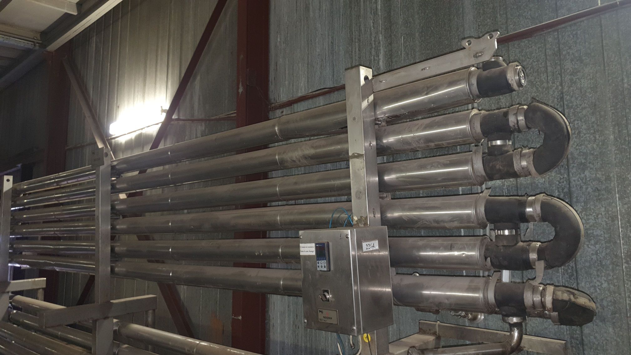 Теплообменник мультитрубчатый Padovan SCAM.MT3/18/52, пр-ть 1500 л/час, использовался на алкогольном предприятии для охлаждение виноматерила, шампанского, пива, может использоваться в работе на других продуктах, для нагрева или охлаждения, производительность на других продуктах, производительность при этом возможно будет другая.