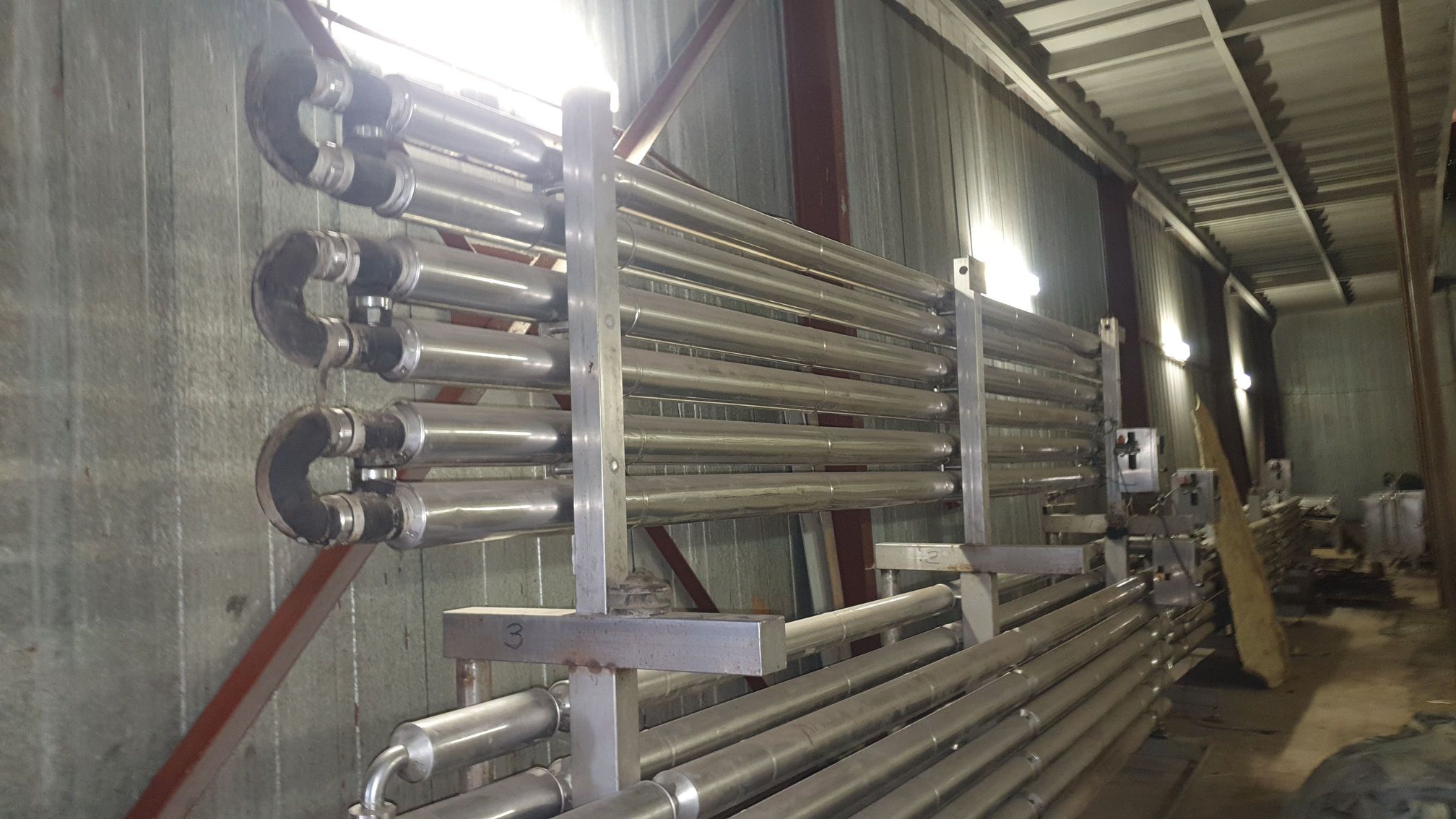 Установка состоит из шести секций трубчатых теплообменников, каждая секция имеет по три трубки под продукт диаметром 15 мм, рабочая длина каждой секции 6 метров. Общая площадь теплообмена установки 5 кв.м.